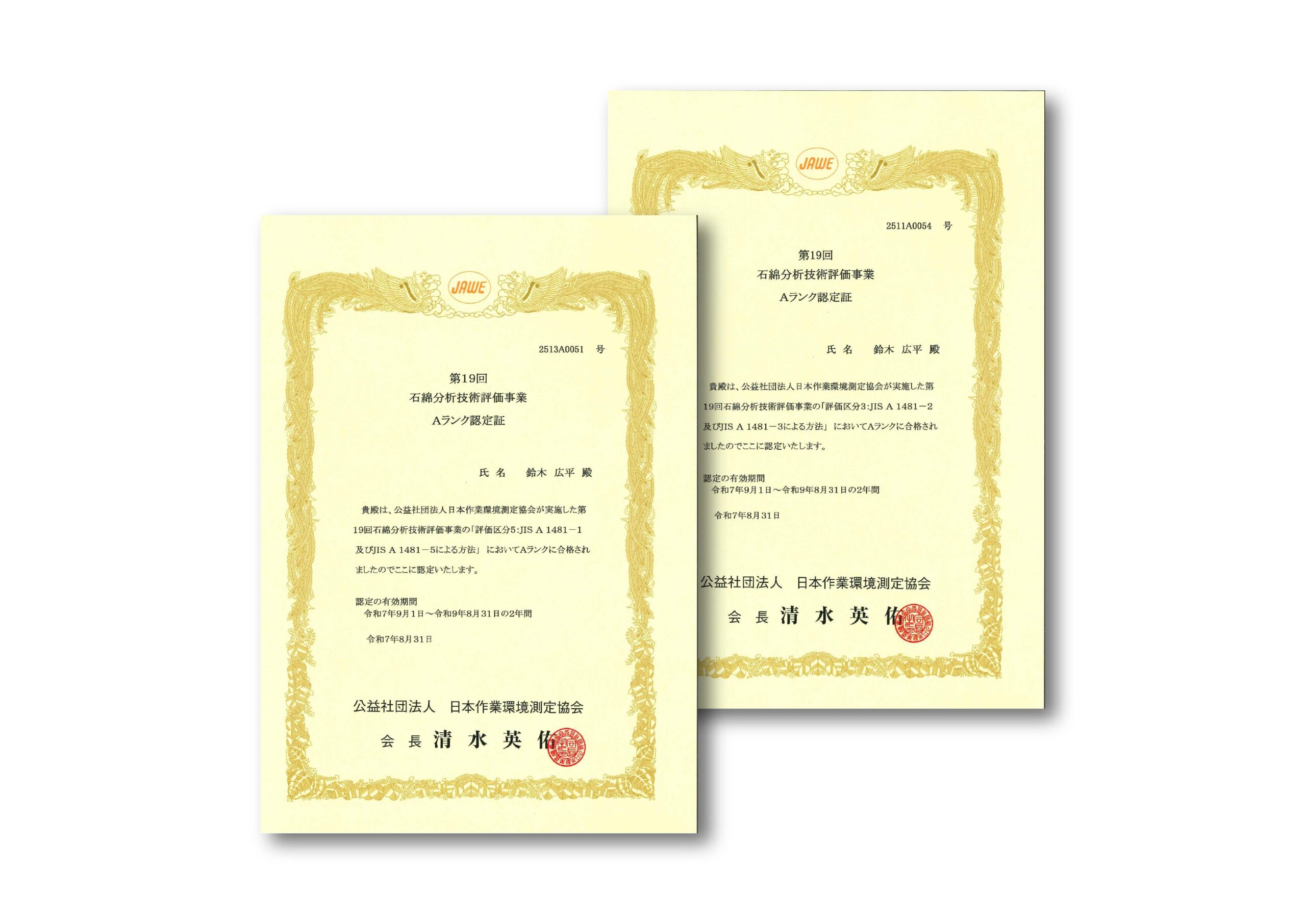 - 石綿分析評価事業 「評価区分3:JIS A1481-2及びJIS A1481-3による方法」Aランク【3人】